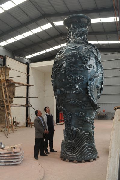 当日,高6.5米、最大直径2.7米、重达7.8吨的世界最大巨型陶瓷九龙瓶在陶瓷名城山东省淄博市淄川区面世
