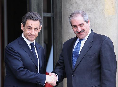 الرئيس الفرنسي نيكولا ساركوزي يرحب بوزير الخارجية الأردني ناصر جودة أمام قصر الاليزيه بالعاصمة الفرنسية أثناء حضوره للمشاركة في قمة باريس في 19 من مارس 2011