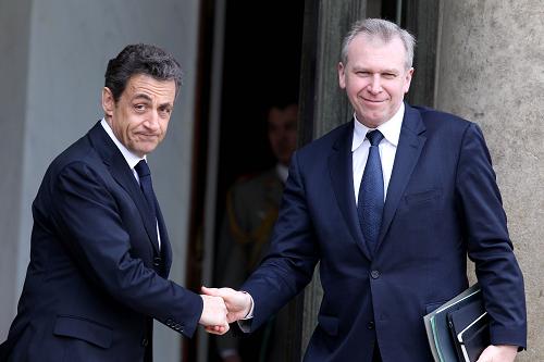 الرئيس الفرنسي نيكولا ساركوزي يرحب برئيس الوزراء البلجيكي لاي تيمو أمام قصر الاليزيه بالعاصمة الفرنسية أثناء حضوره للمشاركة في قمة باريس في 19 من مارس 2011