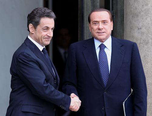 الرئيس الفرنسي نيكولا ساركوزي يرحب برئيس الوزراء الايطالي سيلفيو برلسكوني أمام قصر الاليزيه بالعاصمة الفرنسية أثناء حضوره للمشاركة في قمة باريس في 19 من مارس 2011