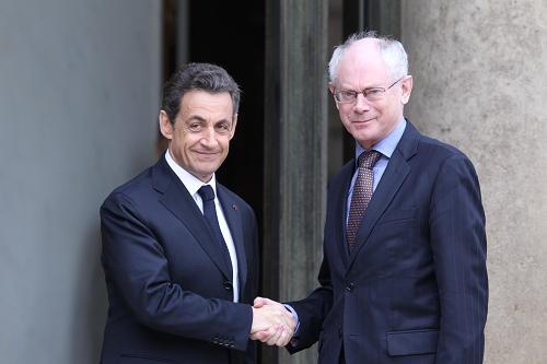 الرئيس الفرنسي نيكولا ساركوزي يرحب برئيس الوزراء اليوناني اندرياس باباندريو أمام قصر الاليزيه بالعاصمة الفرنسية أثناء حضوره للمشاركة في قمة باريس في 19 من مارس 2011