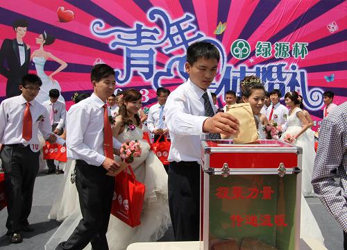 عريس يتبرع باموال لمنكوبي زلزال سيتشوان في مدينة لينيي التابعة لمقاطعة شانغدونغ بشرق الصين في 1 مايو 2013