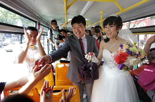 عروسان يوزعان حلويات على ركاب حافلة عندما كانا يتجهان إلى موقع الزفاف بحافلة في مدينة لينيي التابعة لمقاطعة شانغدونغ بشرق الصين في 1 مايو 2013