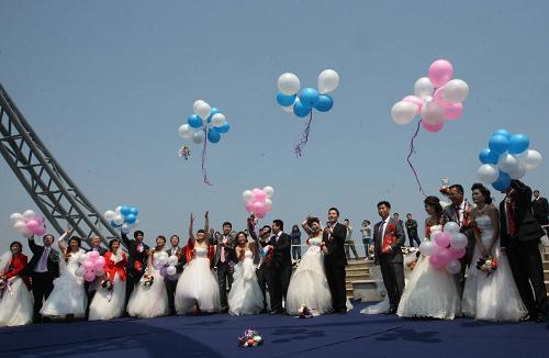 عرسان يطلقون بالونات خلال مراسم زفاف جماعي في الأول من مايو 2013
