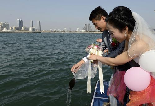 عروسان يطلقان أسماك خلال مراسم زفافهما في الأول مايو 2013