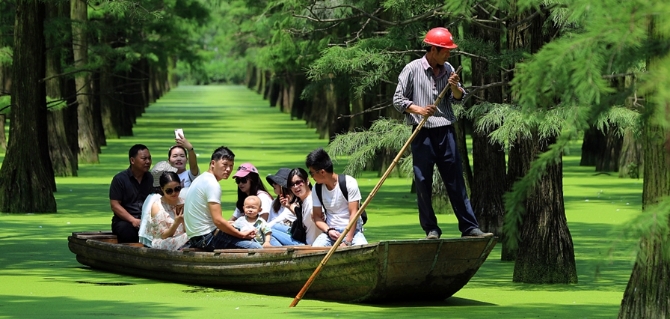 جذبت عشرات الآلاف من أشجار السكويا الصينية التي زرعت في المياه بعمق متر واحد في حديقة تشانغدو بمدينة ووهان حاضرة مقاطعة هوبي وسط الصين، الزوار للتمتع بجمالها وكأنهم يبحرون وسط غابة عائمة سحرية.