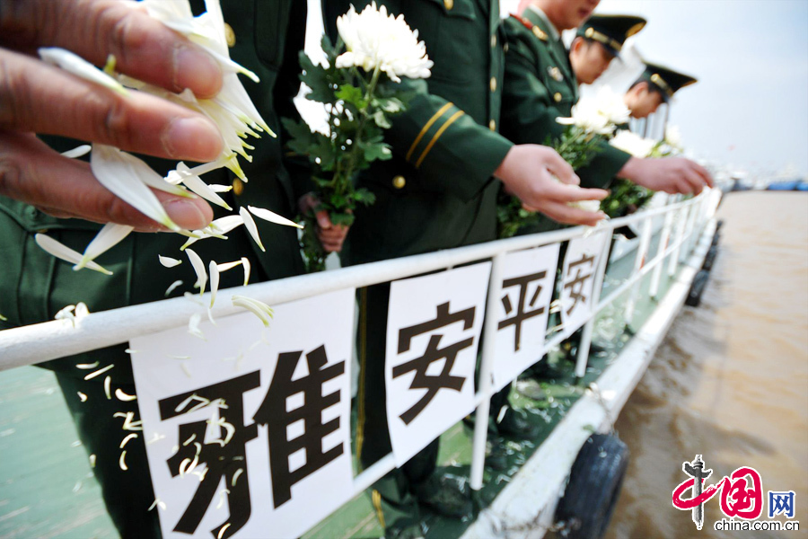 شرطيون ينظمون فعالية حداداً على ضحايا زلزال سيتشوان في مقاطعة تشجيانغ بشرق الصين في 21 ابريل 2013