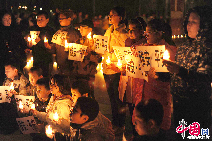 أناس تتوافد على ميدان "شيداي" بمدينة داتشينغ التابعة لمقطعة هيلونغجيانغ في شمال شرق الصين للوقوف حداداً على ضحايا زلزال سيتشوان في 21 ابريل 2013