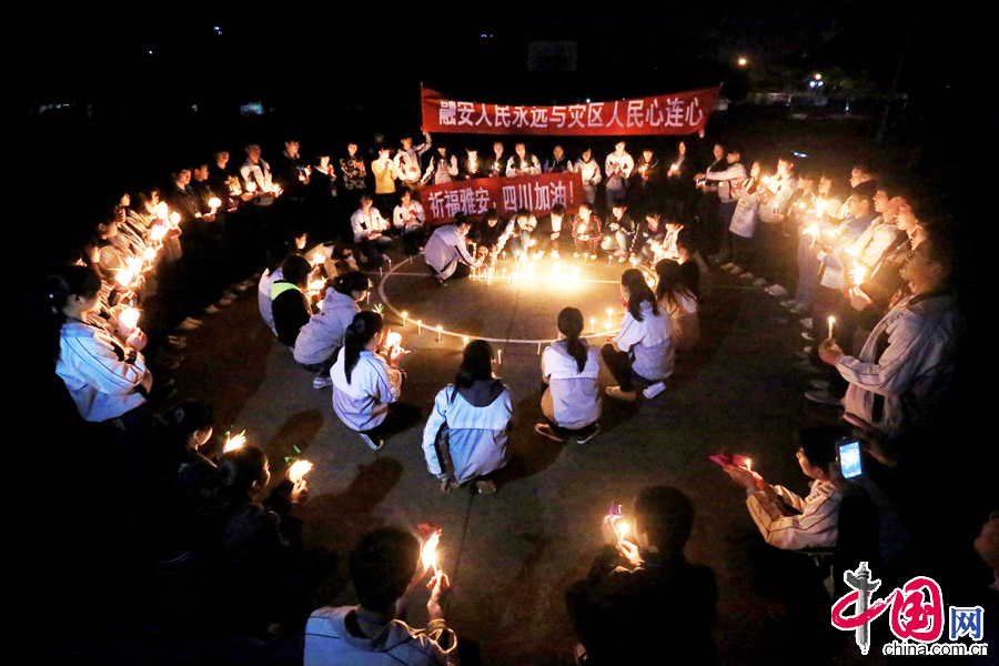 جامعيون يشعلون شموعاً حداداً على ضحايا زلزال سيتشوان بمدينة ليوتشو التابعة لمقاطعة قوانغشي بجنوب غرب الصين في 21 ابريل 2013