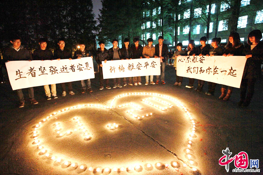 جامعيون يشعلون شموعاً حداداً على ضحايا زلزال سيتشوان في مقاطعة آنهوي بوسط الصين في 21 ابريل 2013