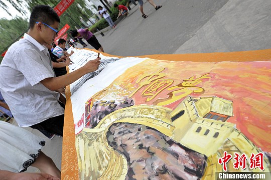 6月5日,在山西林学院内,40余名大学生手绘“中国梦”60米长卷,用绘画的形式表达出自己的梦想