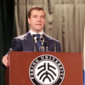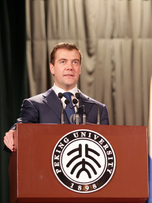 وأشاد الرئيس الروسي الأسبق في خطابه الذي ألقاه أمام حشد كبير من الطلاب والأساتذة في جامعة بكين خلال زيارته للصين في 24 مايو 2008 بعلاقات الصداقة بين موسكو وبكين محفزا الشباب على تطوير وتعزيز العلاقات الثنائية في شتى المجالات.