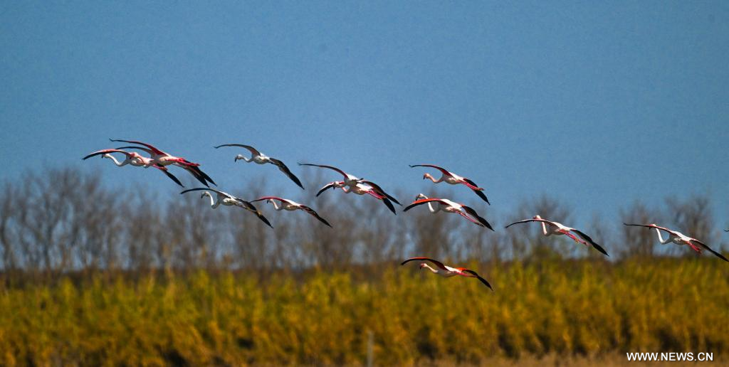 نانجينغ 9 ديسمبر 2025 (شينخوا) في الصورة الملتقطة يوم 8 ديسمبر 2025، طيور النحام تحلق فوق الأراضي الرطبة "تياوتسيني" في دونغتاي بمدينة يانتشنغ بمقاطعة جيانغسو شرقي الصين.