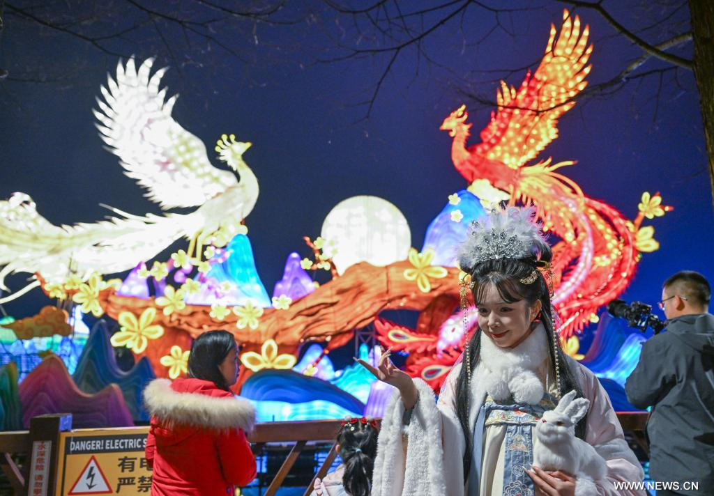 تشونغتشينغ 2 فبراير 2026 (شينخوا) في الصورة الملتقطة يوم 30 يناير 2026، موظفة ترتدي أزياء تقليدية تتفاعل مع الزوار خلال مهرجان الفوانيس في حديقة معرض البستنة في بلدية تشونغتشينغ بجنوب غربي الصين.