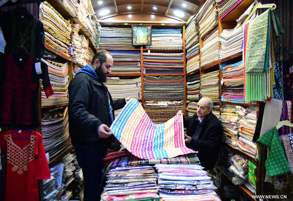 دمشق 5 فبراير 2026 (شينخوا) في الصورة الملتقطة يوم 4 فبراير 2026، رجل يتسوق بأحد متاجر سوق الخياطين في العاصمة السورية دمشق. يشتهر هذا السوق التاريخي تقليديا بأعمال الخياطة وتجارة الأقمشة والملابس.