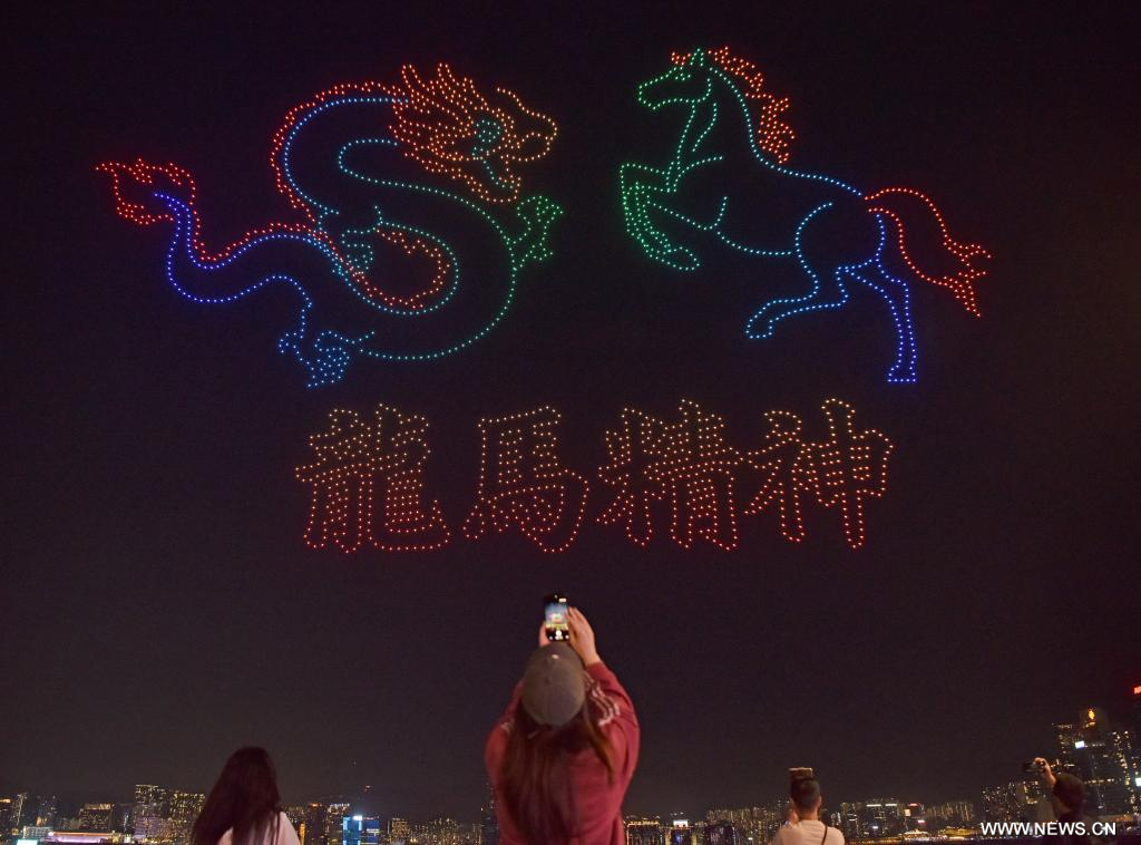 هونغ كونغ 15 فبراير 2026 (شينخوا) في الصورة الملتقطة يوم 14 فبراير 2026، زوار يشاهدون عروضا رائعة تقدمها 2026 طائرة بدون طيار في منطقة هونغ كونغ الإدارية الخاصة بجنوبي الصين.