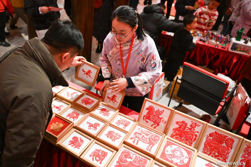بكين 16 فبراير 2026 (شينخوا) في الصورة الملتقطة يوم 15 فبراير 2026، جانب من سوق المنتجات الثقافية للتراث غير المادي في معرض متخصص حول عيد الربيع يقام في متحف الثقافة التقليدية الصينية وأيضا متحف التراث الثقافي الصيني غير المادي في العاصمة الصينية بكين، حيث يجتذب المعرض كثيرا من الزوار للتمتع بالتقاليد الثقافية والشعبية غير المادية حول عيد الربيع.