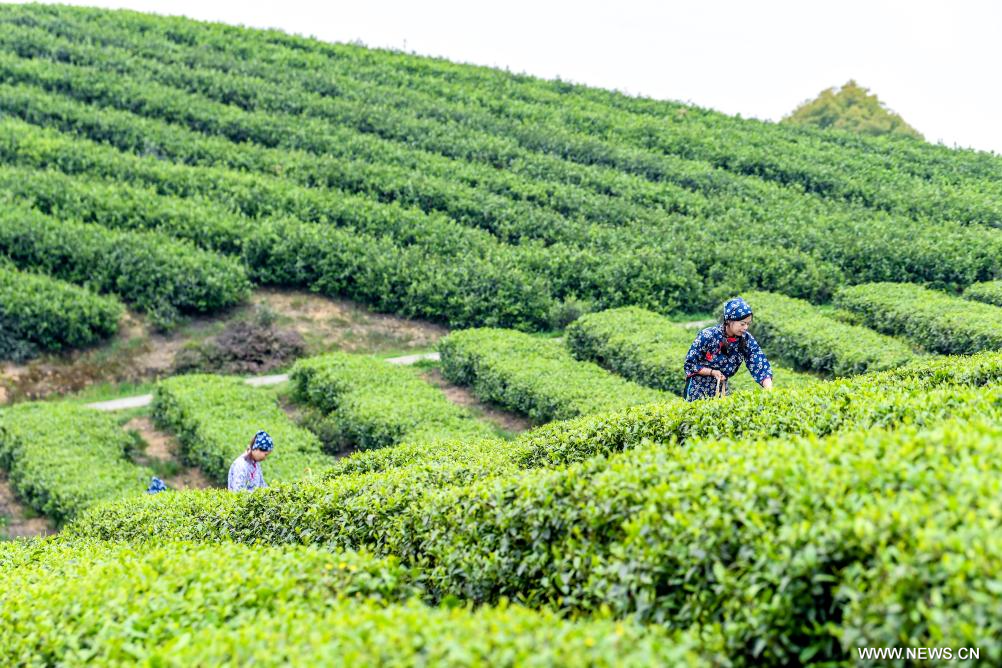تشونغتشينغ 28 مارس 2026 (شينخوا) في الصورة الملتقطة يوم 27 مارس 2026، مزارعات يقطفن أوراق الشاي في حي رونغتشانغ في بلدية تشونغشينغ في جنوب غربي الصين.